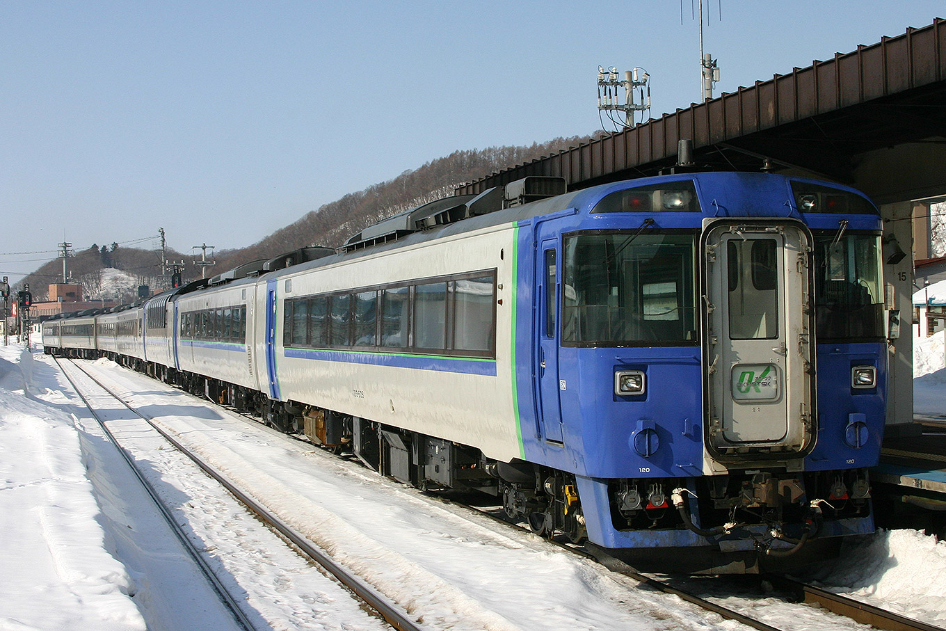 キハ183-505(4号車)、キハ184-7(増22)、キロ182-506(3)、キハ182-47(増21)、キハ182-226(2)、キハ182-23(増1)、キハ183-104(1)の編成で運用に入るキハ183系2004/2/29 網走...