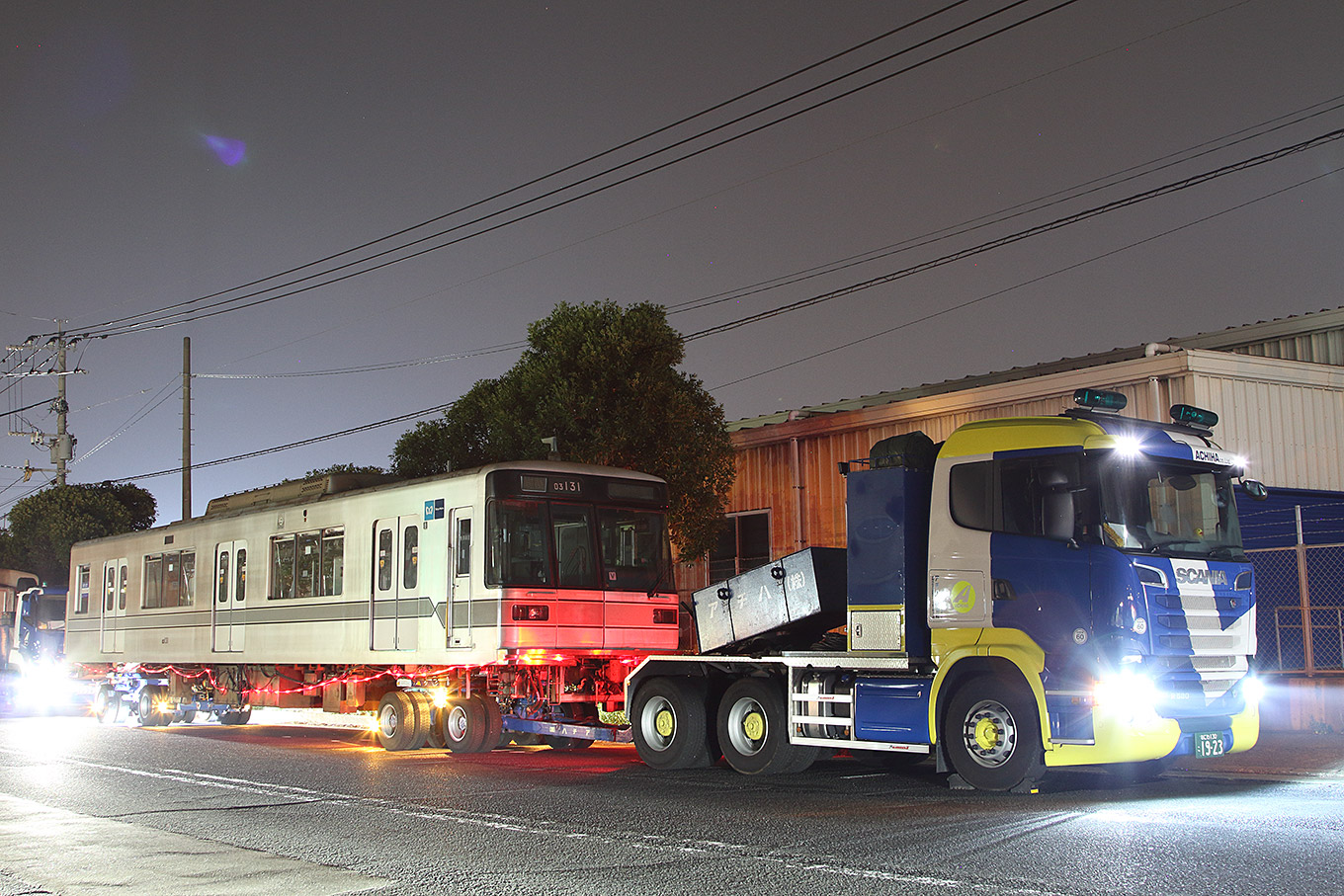 深夜の陸送に向けて埠頭近くで待機する東京メトロ03系の陸送3枚とも 2018/8/3 福岡市内にて営団地下鉄のエンブレムの跡が浮き上がる03系の側面2018/8/3 福岡市内にて関連リンク